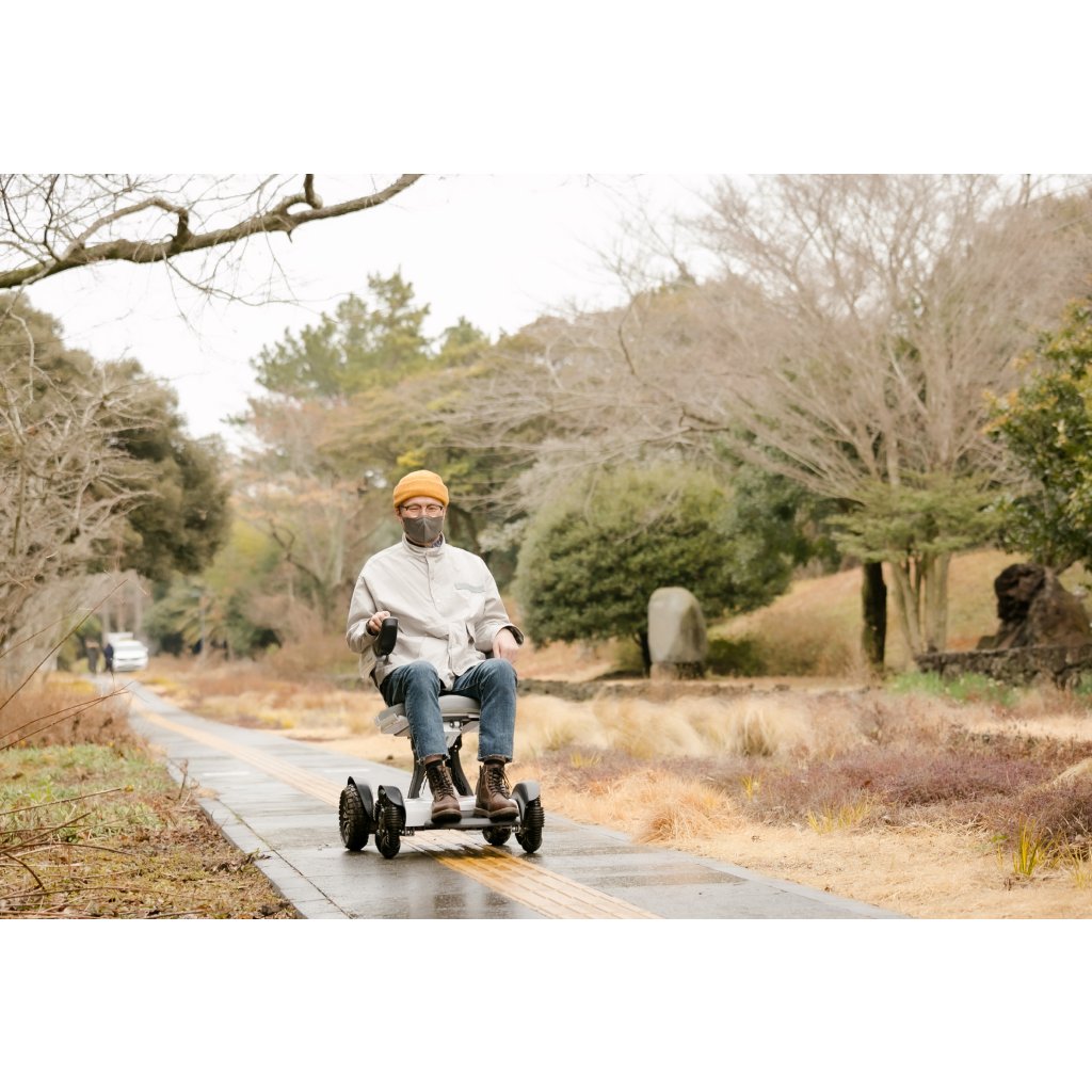 Vozík má integrovaný svařený rám, který používá dva nosníky a kolena k vytvoření pevné nosné konstrukce. Celý podvozek není spojen žádným šroubem, což zajišťuje, že se rám po dlouhém užívání nezdeformuje a neuvolní. Horní konstrukce je provedena z lehkých materiálů a 80 % hmotnosti je rozloženo v prvních 20 cm stroje nad vozovkou, čímž je zaručena ochrana proti převrácení. Vozík lze používat na většině známých površích díky patentovaným předním odpruženým všesměrovým kolům. Tyto kola zajišťují skvělou manévrovatelnost – prakticky se otočíte na místě. Nejsou potřeba žádné řidičské zkušenosti.